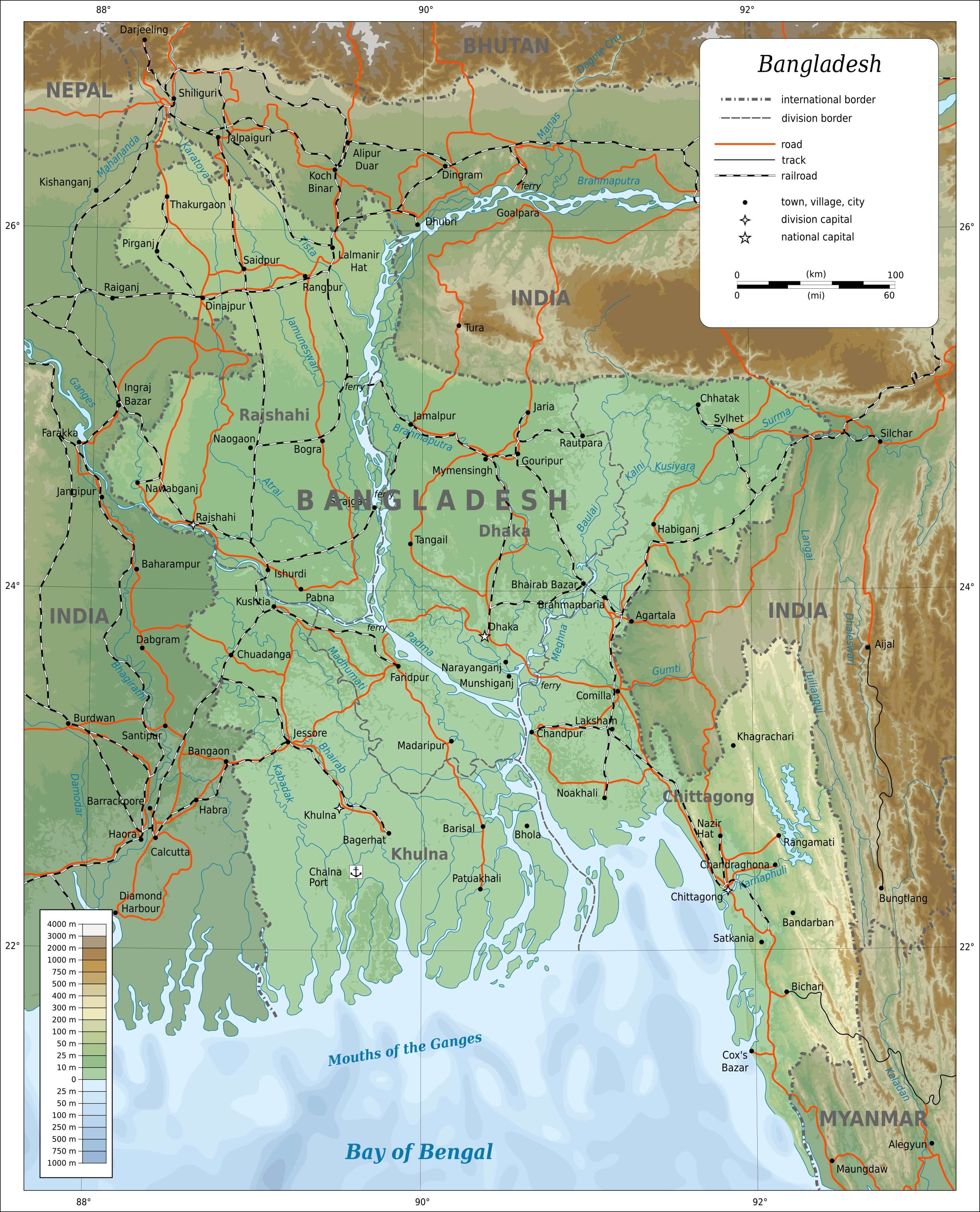 Description: Large map of Bangladesh with cities, roads, railways, rivers and elevation in meters.