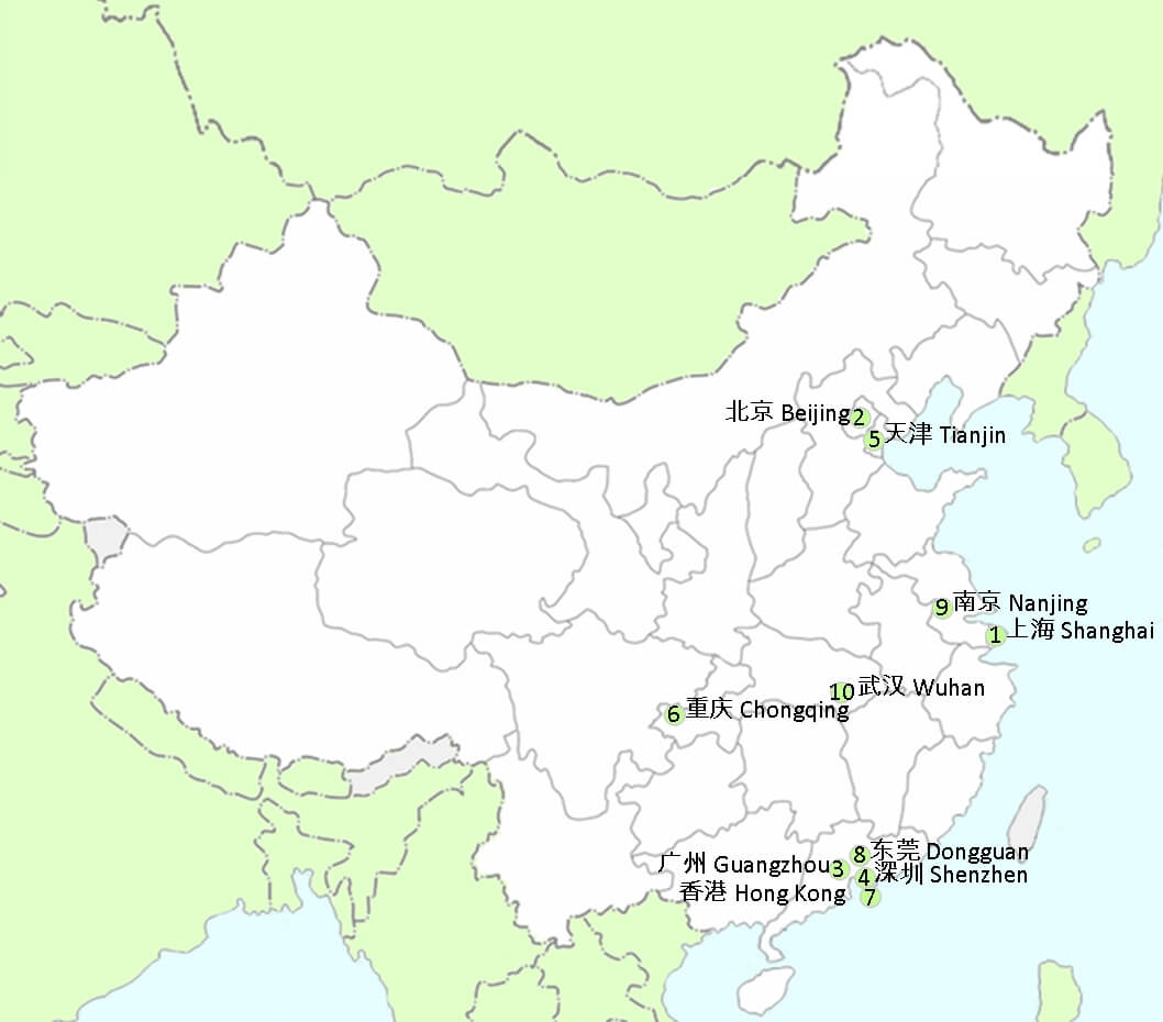 Description: Map of China with the 10 largest cities, city names are written in Chinese and English.