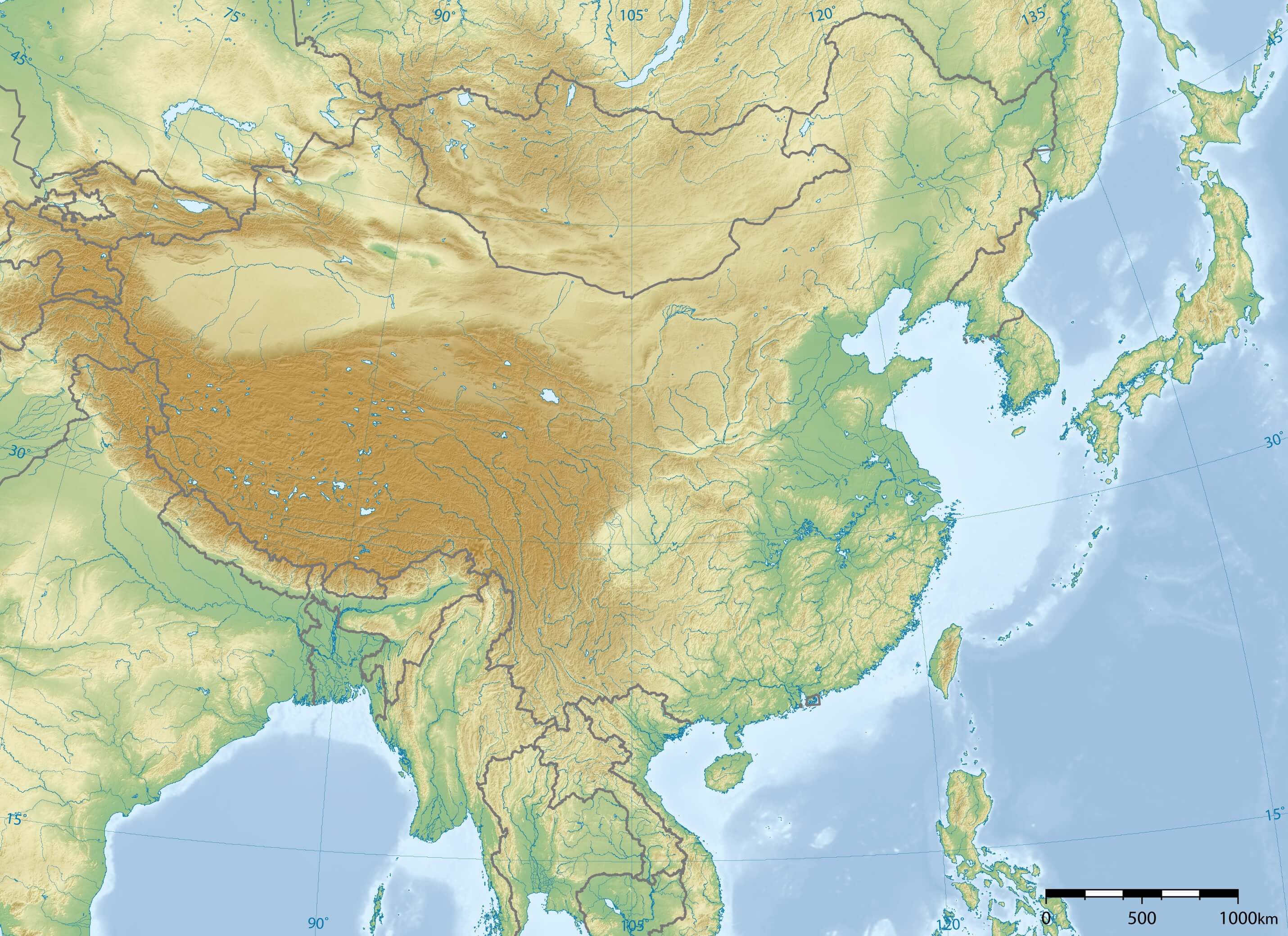 Description: Topographic map of China, accurate map with rivers, lakes, border and surroundings.