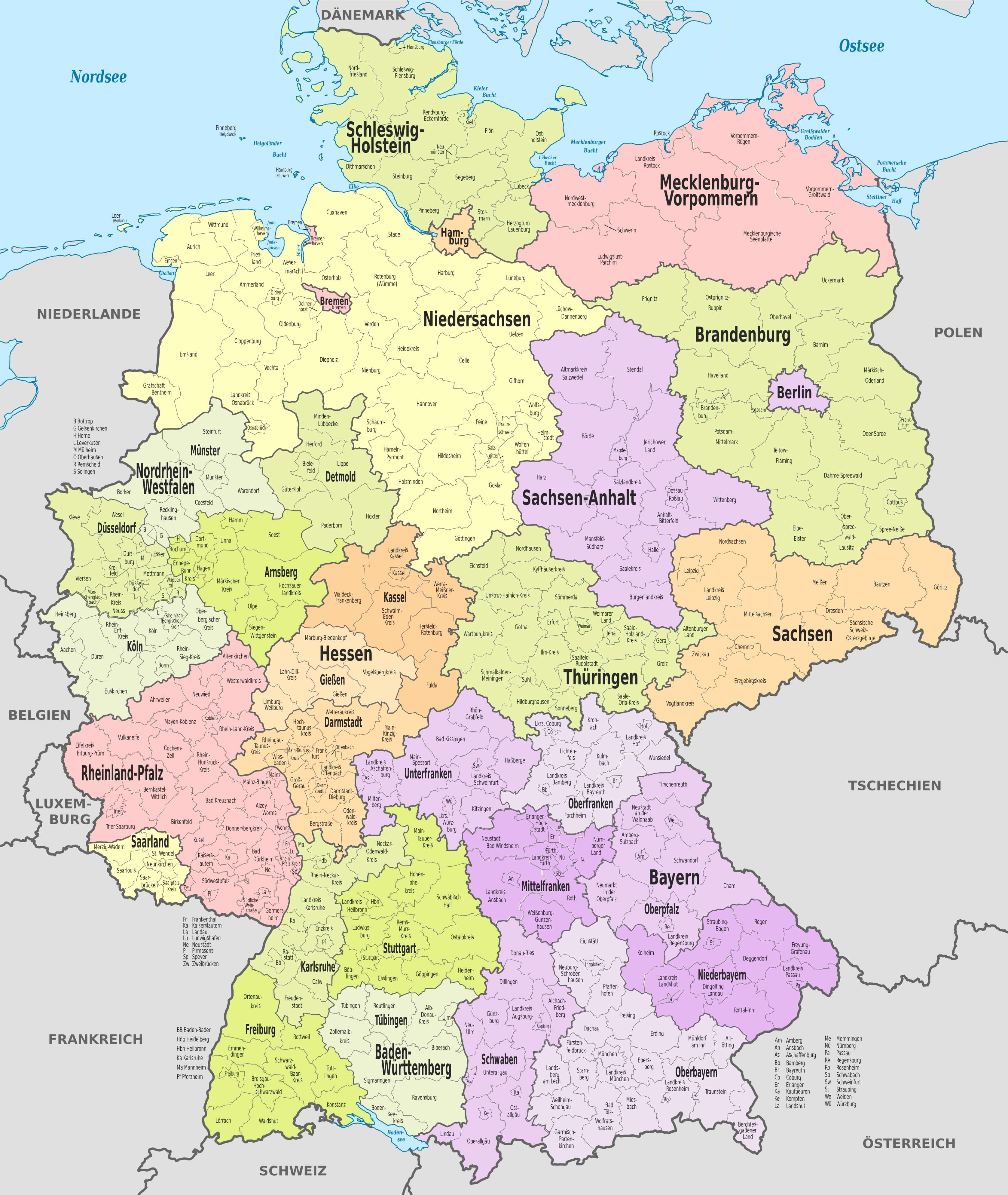 Description: Large administrative map of Germany in German with colored regions and districts.