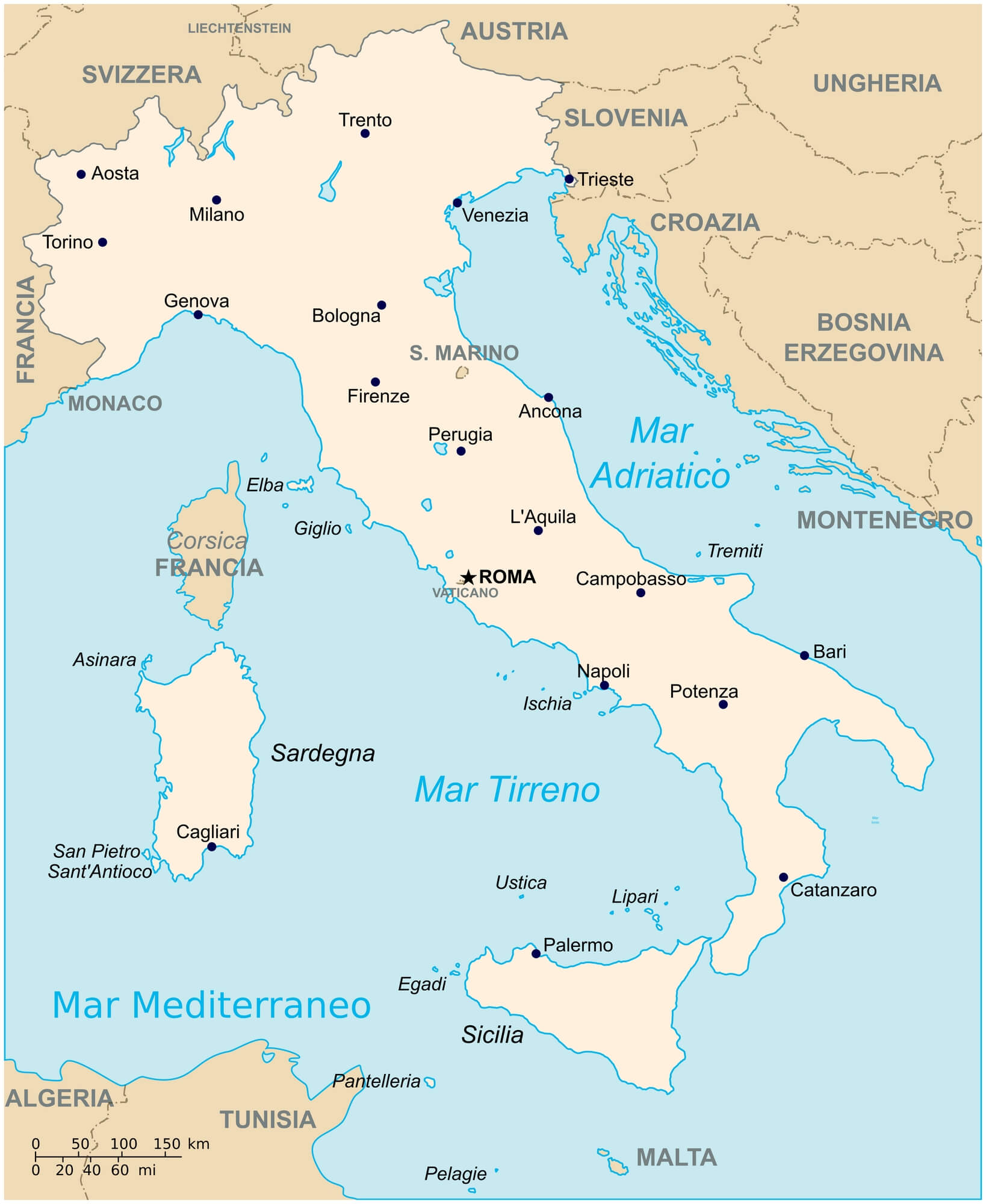 Description: Large detailed map of Italy with major cities, small towns, main and secondary roads, forests, rivers and lakes.