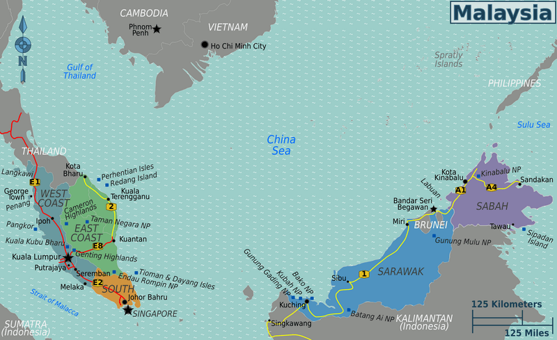 Description: Map of Malaysia with cities, regions, roads and islands.