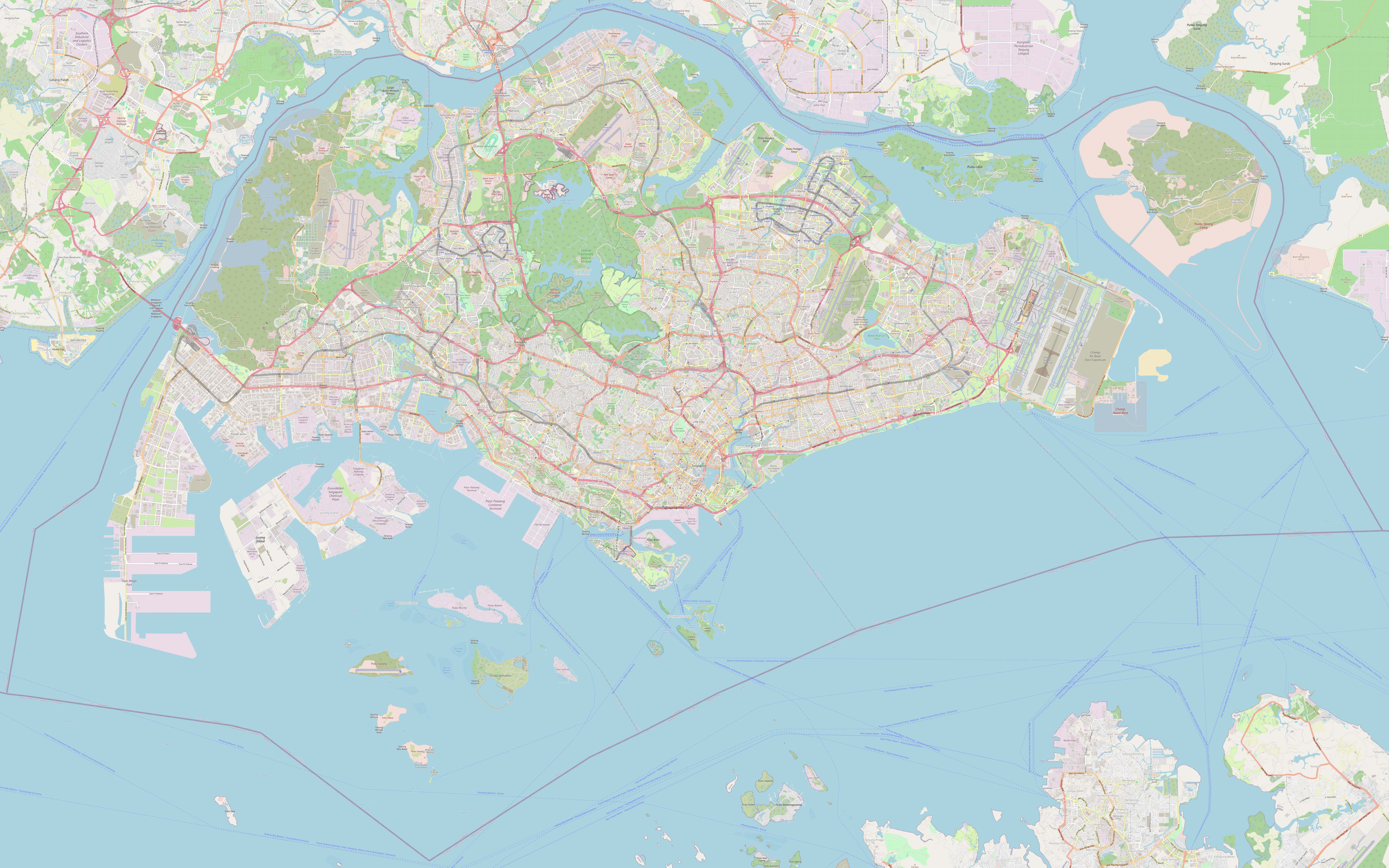Description: Detailed map of Singapore, with roads, streets, parks, islands and airports.