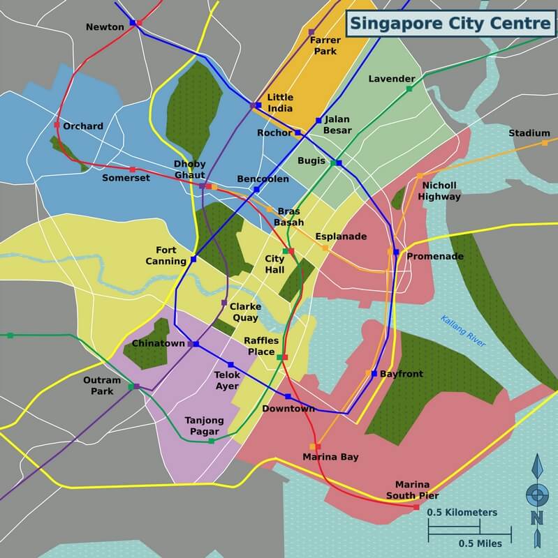Description: Map of downtown Singapore with colored districts, public transport and MRT station names.