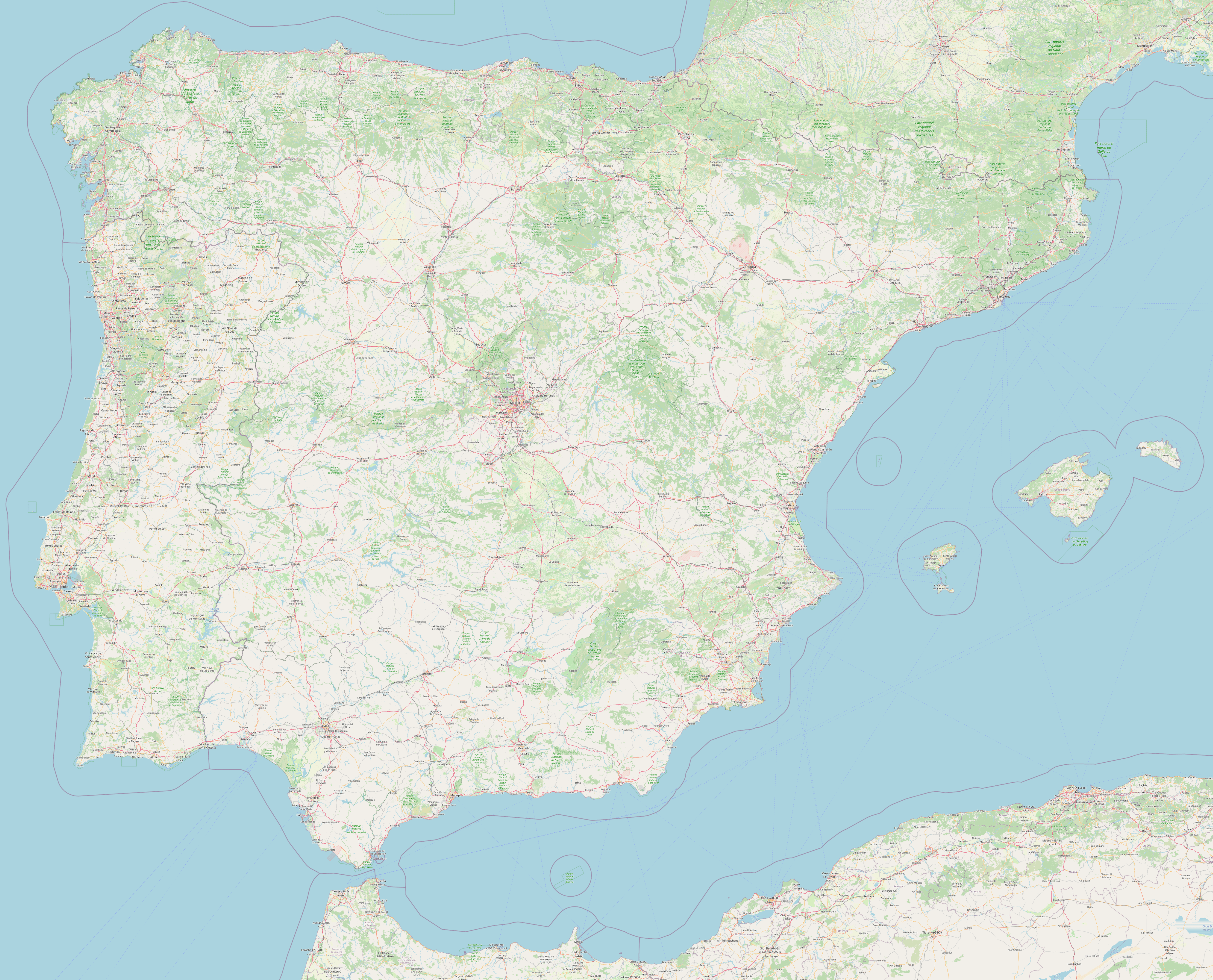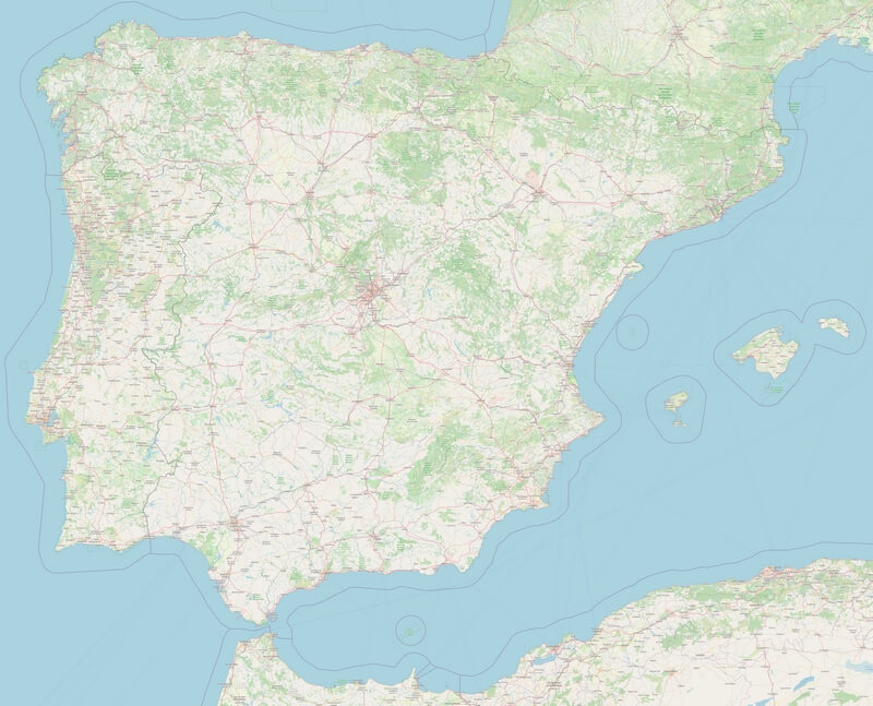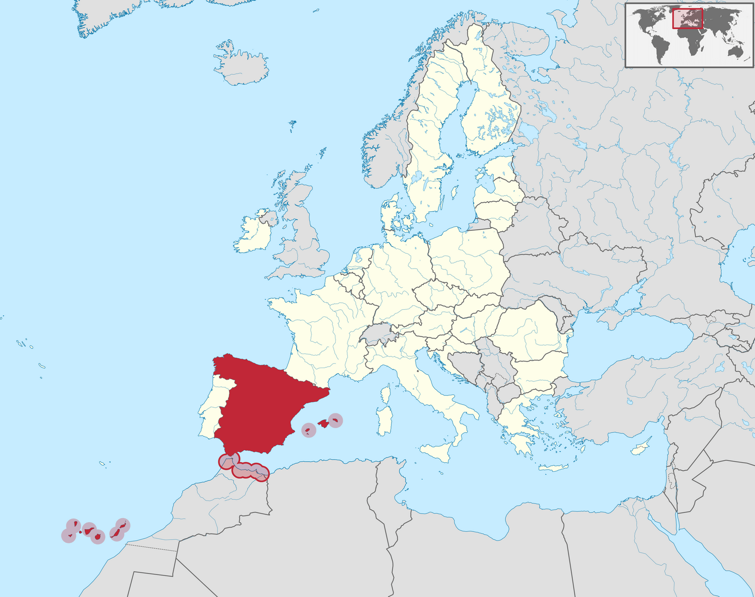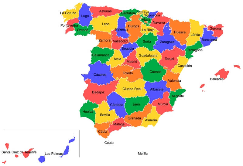Description: Large detailed map of Spain with cities, towns, secondary and main roads, rivers, forests and islands.
