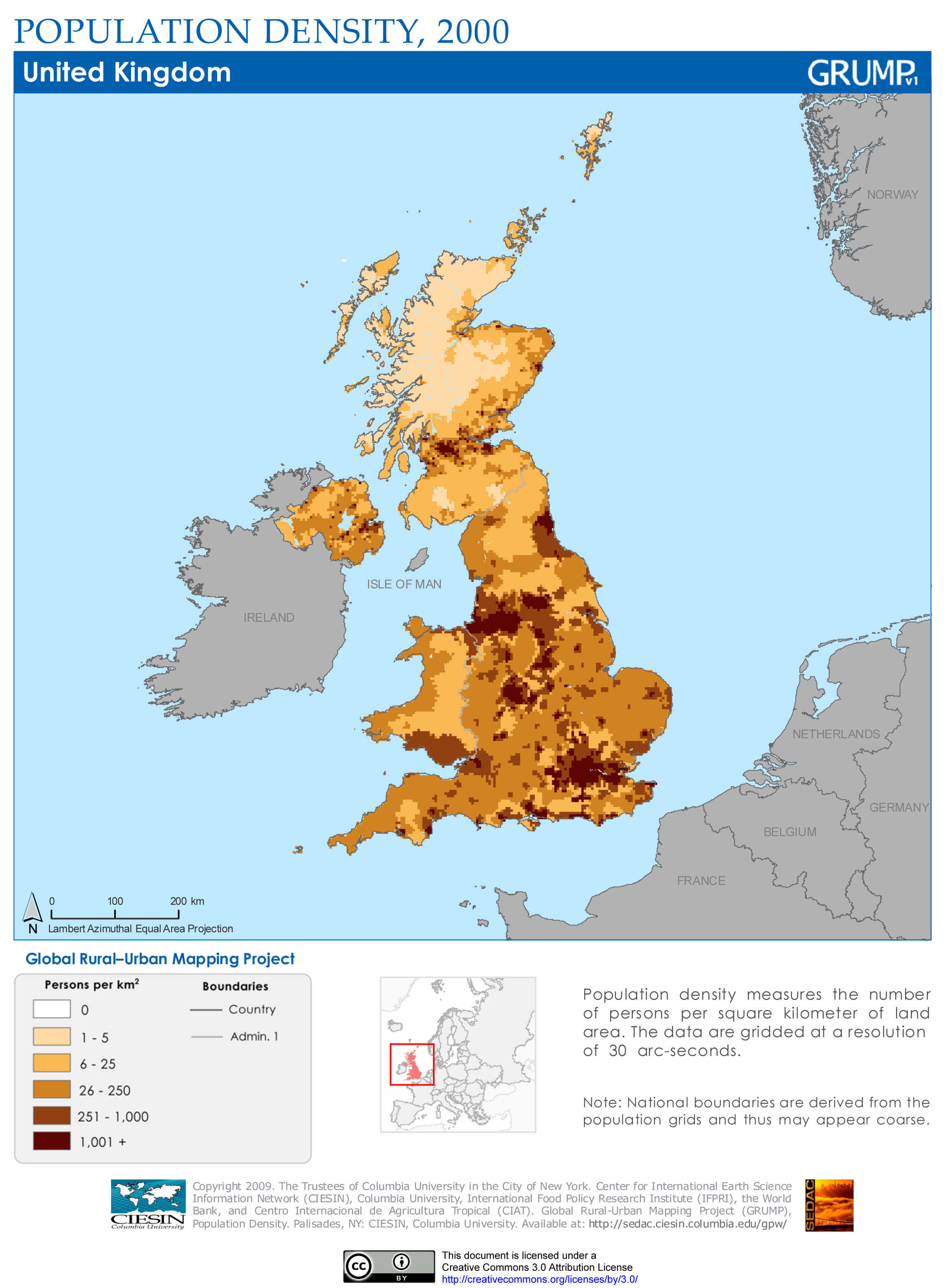 Description: Population density map of the United Kingdom in 2000 with the number of inhabitants per square kilometer.